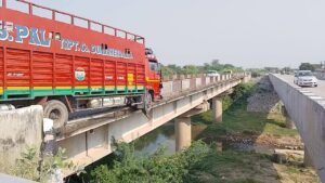 लोहिया पुल पर हादसा: डीसीएम ट्रेलर की टक्कर से पुल की ग्रिल तोड़कर लटकी, चालक बाल-बाल बचाः-