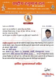 राहुल यादव ने कहा कि वह राष्ट्रीय हनुमान दल में अपनी जिम्मेदारी को पूरी निष्ठा और ईमानदारी के साथ निभाएंगे। वह हिंदू राष्ट्र के लिए लोगों को जागरूक करने और सनातन धर्म को बढ़ावा देने के लिए काम करेंगे।